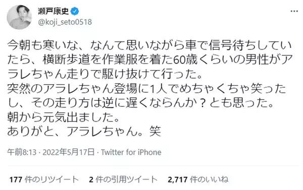 瀬戸さんは5月17日、自身のTwitterに「今朝も寒いな、なんて思いながら車で信号待ちしていたら、横断歩道を作業服を着た60歳くらいの男性がアラレちゃん走りで駆け抜けて行った」と切り出すと、続けて「突然のアラレちゃん登場に1人でめちゃくちゃ笑ったし、その走り方は逆に遅くならんか?とも思った。朝から元気出ました。ありがと、アラレちゃん。笑」と笑いを交えてエピソードを披露。