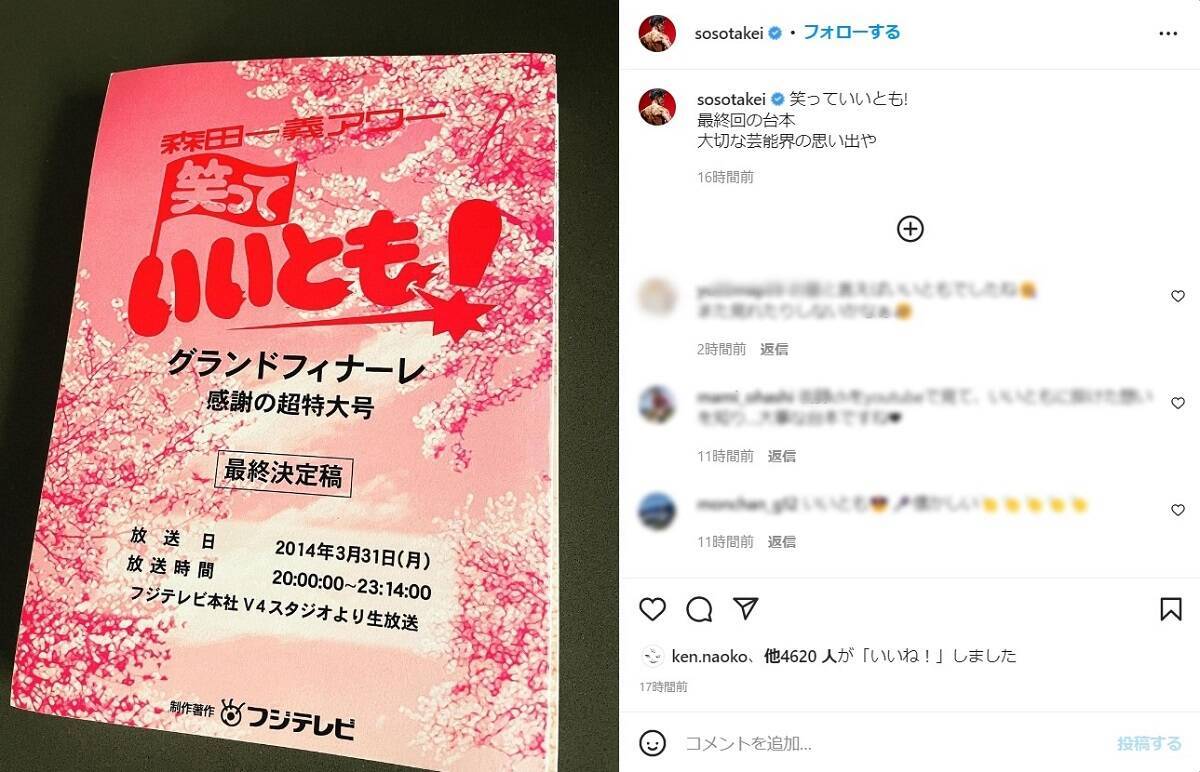 タレントの武井壮さんが、その最終回の台本を「大切な芸能界の思い出」として、Instagramにて写真で紹介しました。