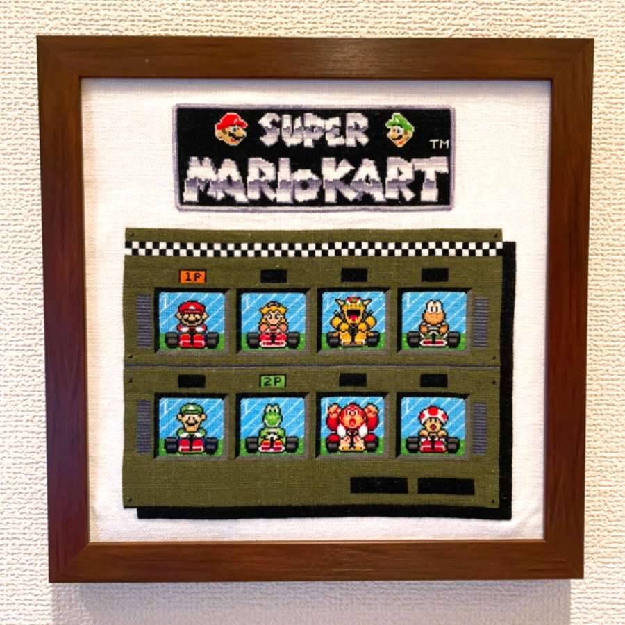 そんなマリオカートをテーマにした刺繍作品に挑戦したのは、ツイッターユーザー・さきイカさんです。タイトルロゴに加え、ゲームに登場する8人が一堂に会する「キャラクターセレクト」の画面を再現した作品は、プレイしたことがある人であれば誰もが「懐かしい!」と感じるはず。