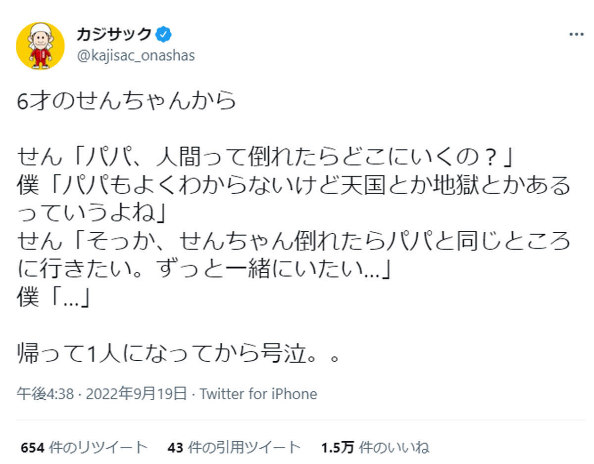カジサックさんは9月19日、自身の公式Twitterに「6才のせんちゃんから、せん“パパ、人間って倒れたらどこにいくの?” 僕“パパもよくわからないけど天国とか地獄とかあるっていうよね”」と、せんちゃんから6才ならではの無垢な質問を投げかけられたことを明かしました。