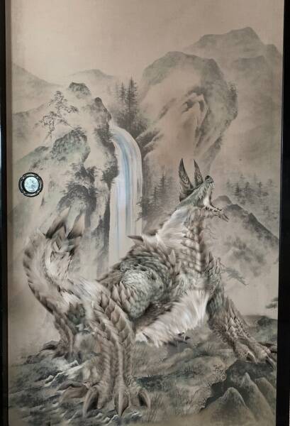 10時間ほどをかけて完成させた作品は、ふすまの雰囲気にぴったりマッチ。背景の山や滝の絵は初めから描かれていたものですが、それらと調和する色味と質感は、ヌツキさんがこだわったポイントのひとつです。