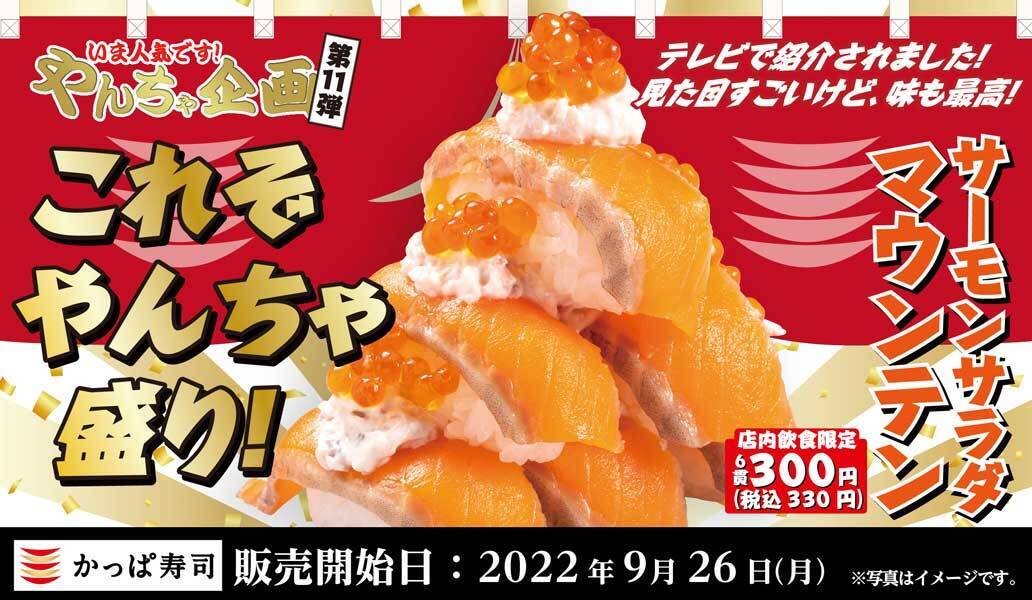 かっぱ寿司全店にて「本気寿司シリーズ」やんちゃ企画第11弾「サーモンサラダマウンテン」が、9月26日~10月2日の期間販売されます。価格は税込330円。