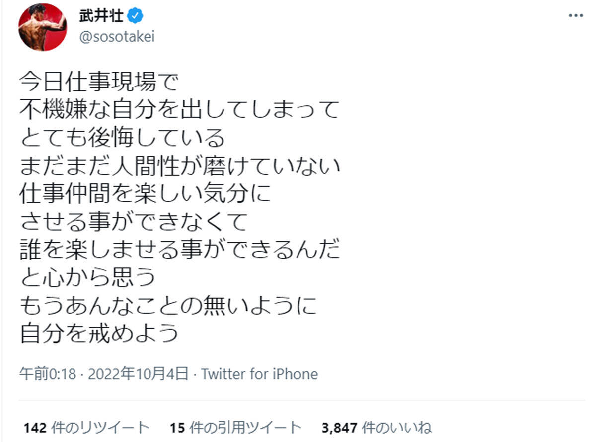 武井さんは10月3日、自身の公式Twitterに「今日仕事現場で不機嫌な自分を出してしまってとても後悔している」と切り出すと、「まだまだ人間性が磨けていない 仕事仲間を楽しい気分にさせる事ができなくて誰を楽しませる事ができるんだと心から思う」と武井さんらしいストイックな心情を吐露。