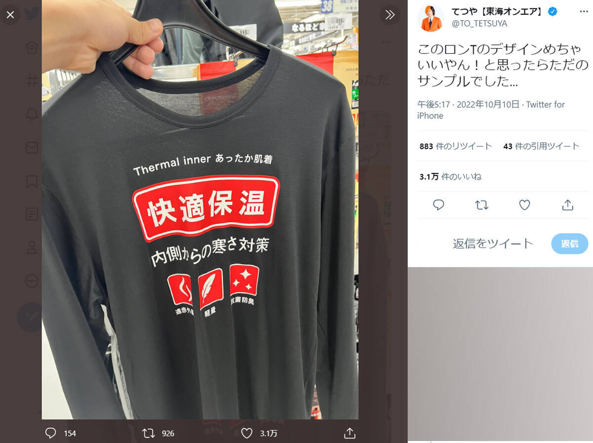 てつやさんはこの日、自身の公式Twitterに1枚の写真を投稿。展示されていたであろうハンガーごと、ロングTシャツのような服のフロントデザインを写しており、そこには「快適保温 内側からの寒さ対策」と日本語でプリントされています。