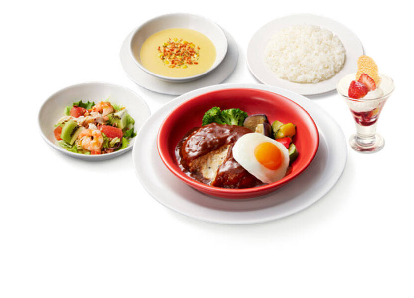 お子様ランチの内容は、鳥羽シェフ特製のデミグラスソースがかかった「チーズINハンバーグ」と「チキンライス」、「特大海老フライ(タルタルソース)&ポテトフライ」。他にスープの「コーンポタージュ~フライドオニオンをのせて~」と、デザートの「グラスショートケーキ」が提供されます。