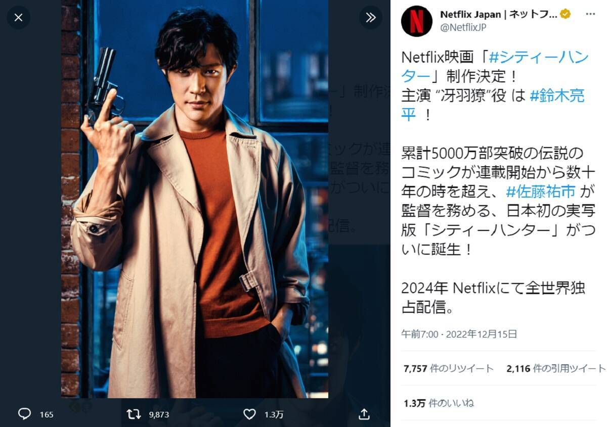 北条司さん原作の漫画「シティーハンター」が、Netflix映画として日本初の実写化が決定。Netflix Japanの公式Twitterで12月15日に発表されました。主演の冴羽獠を演じる鈴木亮平さんのビジュアルも公開されると、SNS上では他のキャラクターは誰が演じるのか?予想合戦が開始。中でも「海坊主は〇〇!」と白熱しています。