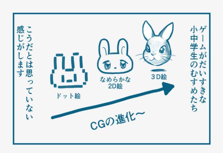 大きく2コマに分けられた漫画の1コマ目に描かれているのは、大人世代のグラフィック観。「ドット絵」「なめらかな2D絵」「3D絵」と分けられた3種類のうさぎの下に右方向の矢印が付けられており、左から順番に進化してきたことが瞬時に理解できます。