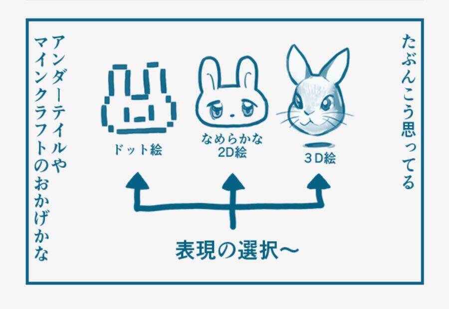 一方の2コマ目には、てらちあさんのお子さんである、今の小中学生世代のグラフィック観が。「ドット絵」「なめらかな2D絵」「3D絵」の下には三叉の矢印がそれぞれに向けられており、「表現の選択」と書かれています。