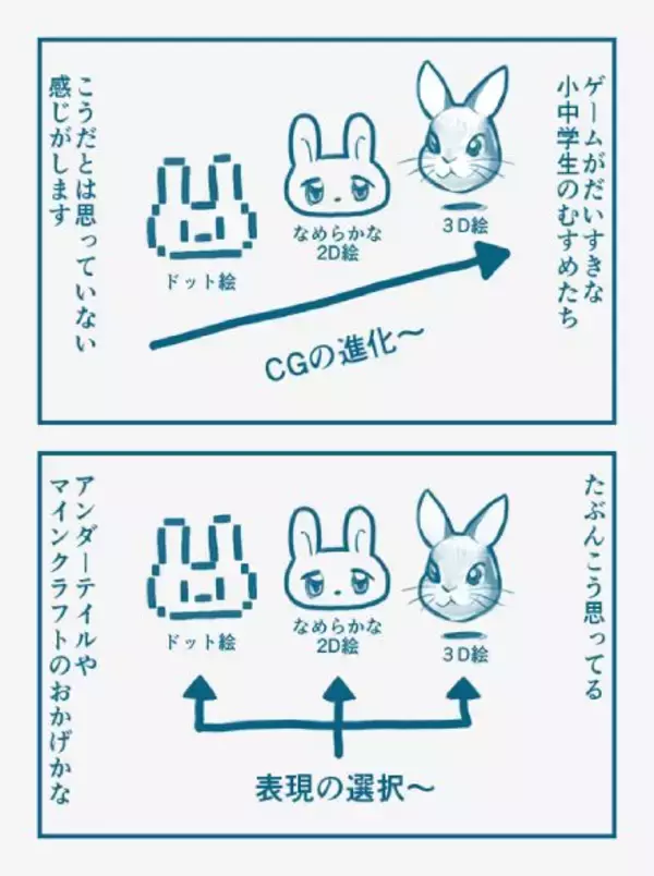 大きく2コマに分けられた漫画の1コマ目に描かれているのは、大人世代のグラフィック観。「ドット絵」「なめらかな2D絵」「3D絵」と分けられた3種類のうさぎの下に右方向の矢印が付けられており、左から順番に進化してきたことが瞬時に理解できます。