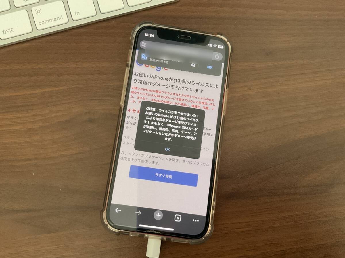 「お使いのiPhoneがウイルスにより深刻なダメージを受けています」「ウイルスが見つかりました」「システムが破損しています」など不安を煽る文言が書かれていますが、これは「フェイクアラート」といわれる、「偽警告」です。