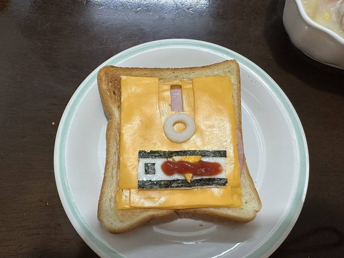 レトロゲームが大好きというアーティさんがSNSに自身の朝ご飯を投稿。トーストした食パンにチーズをのせた普通の朝ご飯と思いきや、チーズがディスクシステムのディスクカードに!