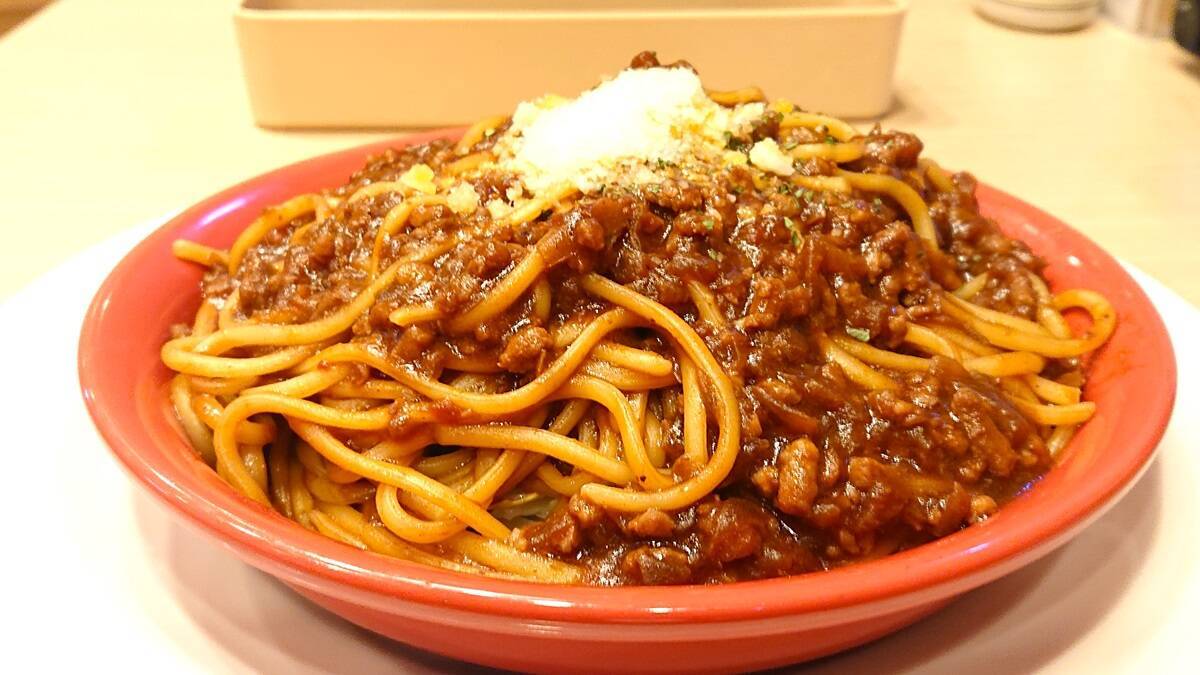 麺をフォークに絡めてパクリ!麺のモチモチした食感と、粉チーズでコクが増した挽き肉たっぷりのミートソースが相性バツグンです。思う存分、ミートソースパスタの味わいを楽しめます。食べても食べても無くならない感じが最高!これぞデカ盛りだ!