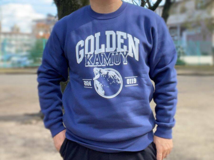 サイズはLで、カラーはネイビー一色。前面には「GOLDEN KAMUY」の文字や、作品に欠かせない存在であるヒグマのロゴが大胆にプリントされています。スポーツライクな印象で、カジュアルな着こなしと相性抜群でしょう。