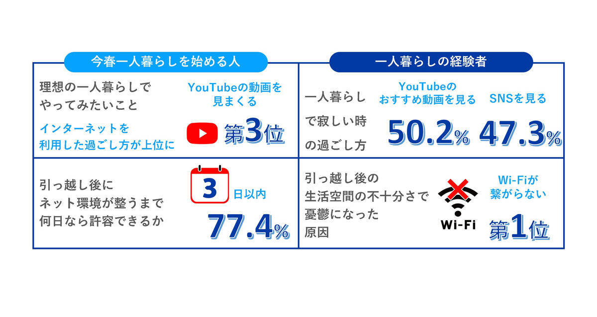 この春から初めて一人暮らしをする人、一人暮らしを経験したことのある人を対象にした「若者の一人暮らしにおけるネット環境に関する調査」の結果が発表されました。