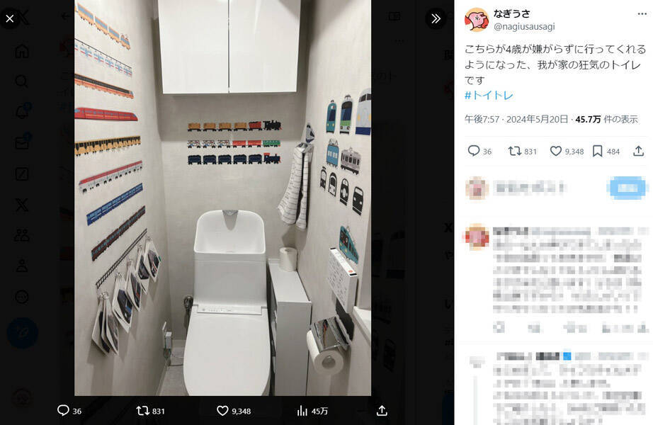 このトイレの写真をなぎうさんが自身のSNSに投稿すると、「素敵なアイデア」、「愛がいっぱい」、「楽しいトイレ」といった声や、「我が家もこうなっている」、「家のトイレはプリンセスだらけ」、「凄まじい量のトーマスを貼りまくった」など、同じように工夫をしている人からの声が集まっています。