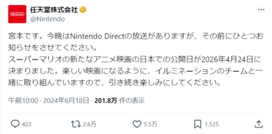 任天堂株式会社は6月18日、アニメ映画「スーパーマリオブラザーズ」の新作公開日が2026年4月24日に決定したことを、公式Xアカウントおよび公式HPで“サラッと”発表しました。