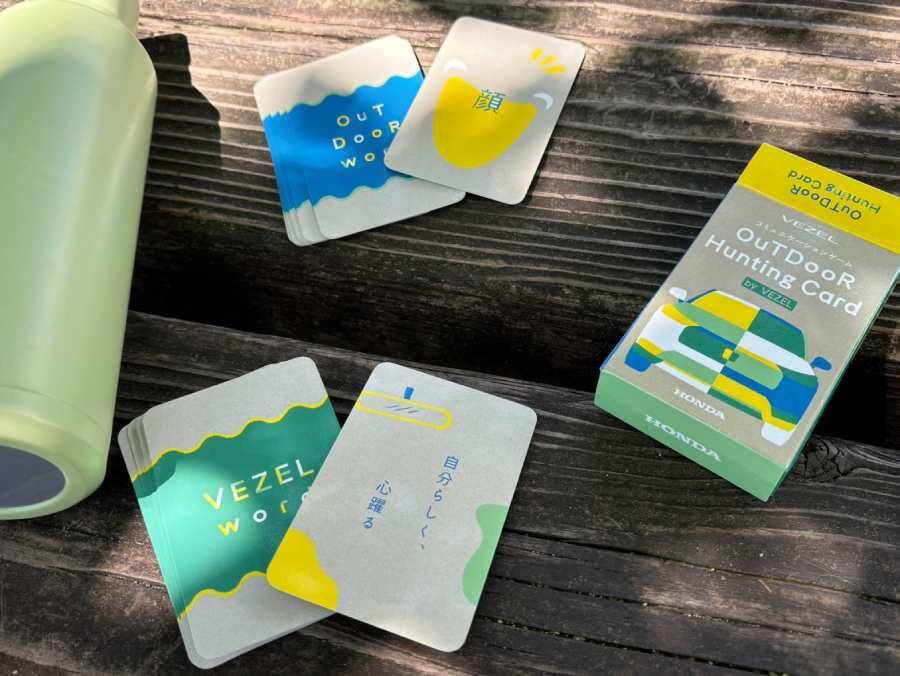 本ゲームは公園やキャンプ場、海、山などの豊かな自然を感じられる屋外で遊ぶことを想定したゲーム。コンパクトSUV「VEZEL(ヴェゼル)」のカタログから、車の特長や世界観を表す形容詞を抜き出した「VEZELワード」(30枚)と、自然や人を表す名詞の「アウトドアワード」(15枚)の2種類のカードを使います。