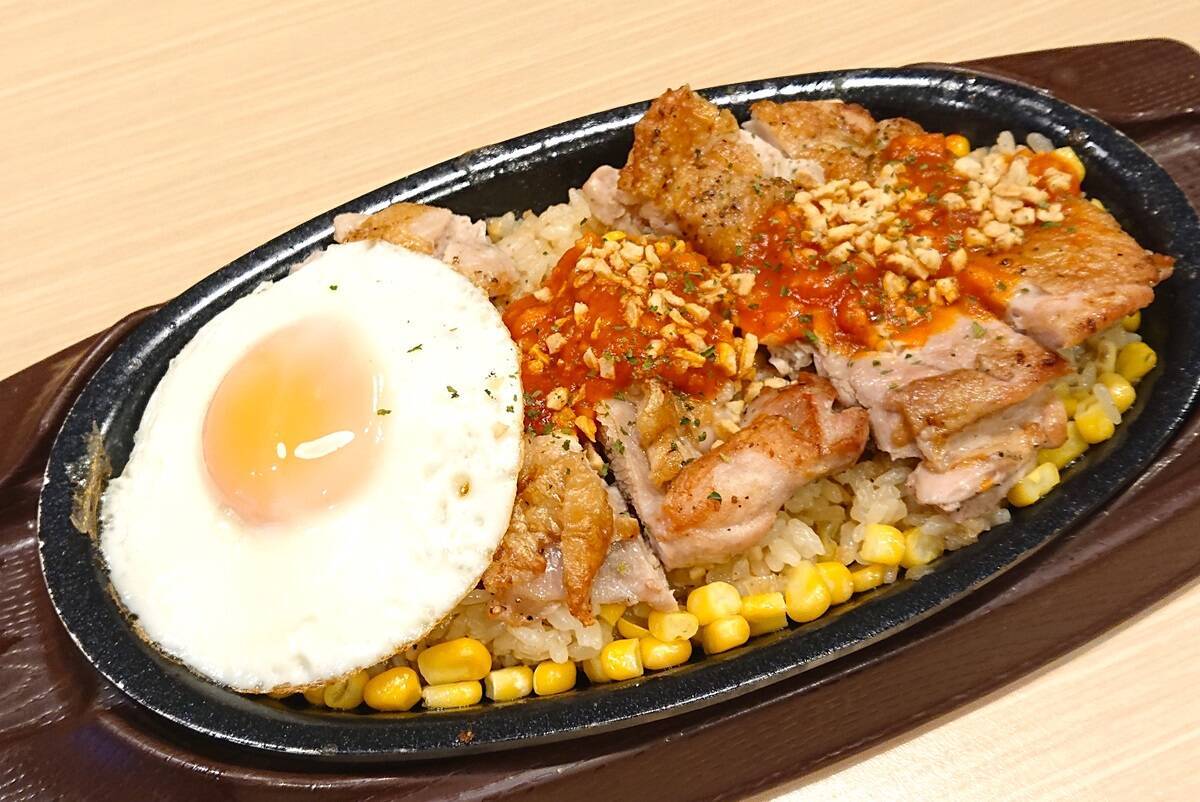 数分後、ネコ型配膳ロボットに連れられて筆者の目の前に姿を現した「やんちゃガーリックチキン鉄板ピラフ」。熱々の鉄板の上に、コーンがたっぷり入ったピラフと大きくて存在感抜群なチキンステーキがドーンと盛られ、睨みをきかせています。