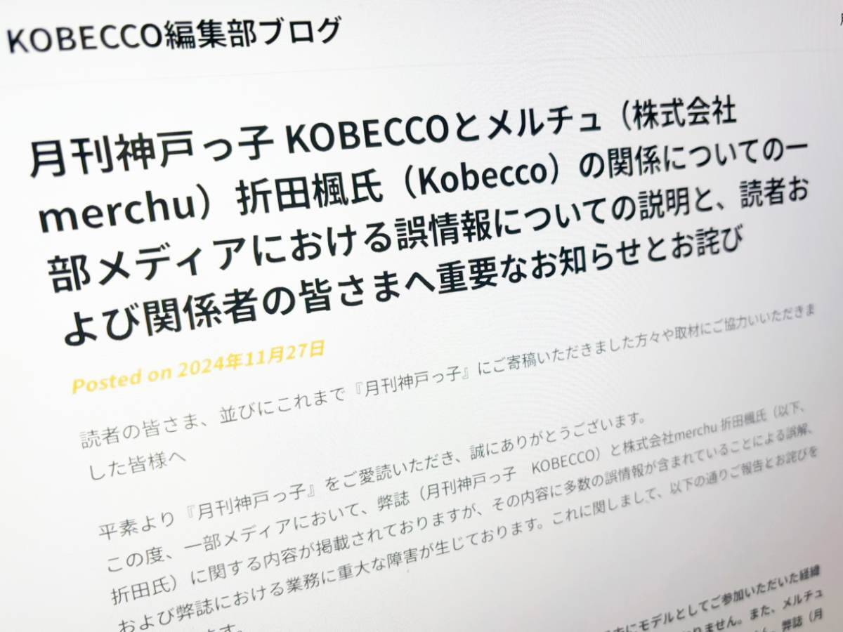 KOBECCO編集部ブログ「月刊神戸っ子 KOBECCOとメルチュ(株式会社merchu)折田楓氏(Kobecco)の関係についての一部メディアにおける誤情報についての説明と、読者および関係者の皆さまへ重要なお知らせとお詫び」