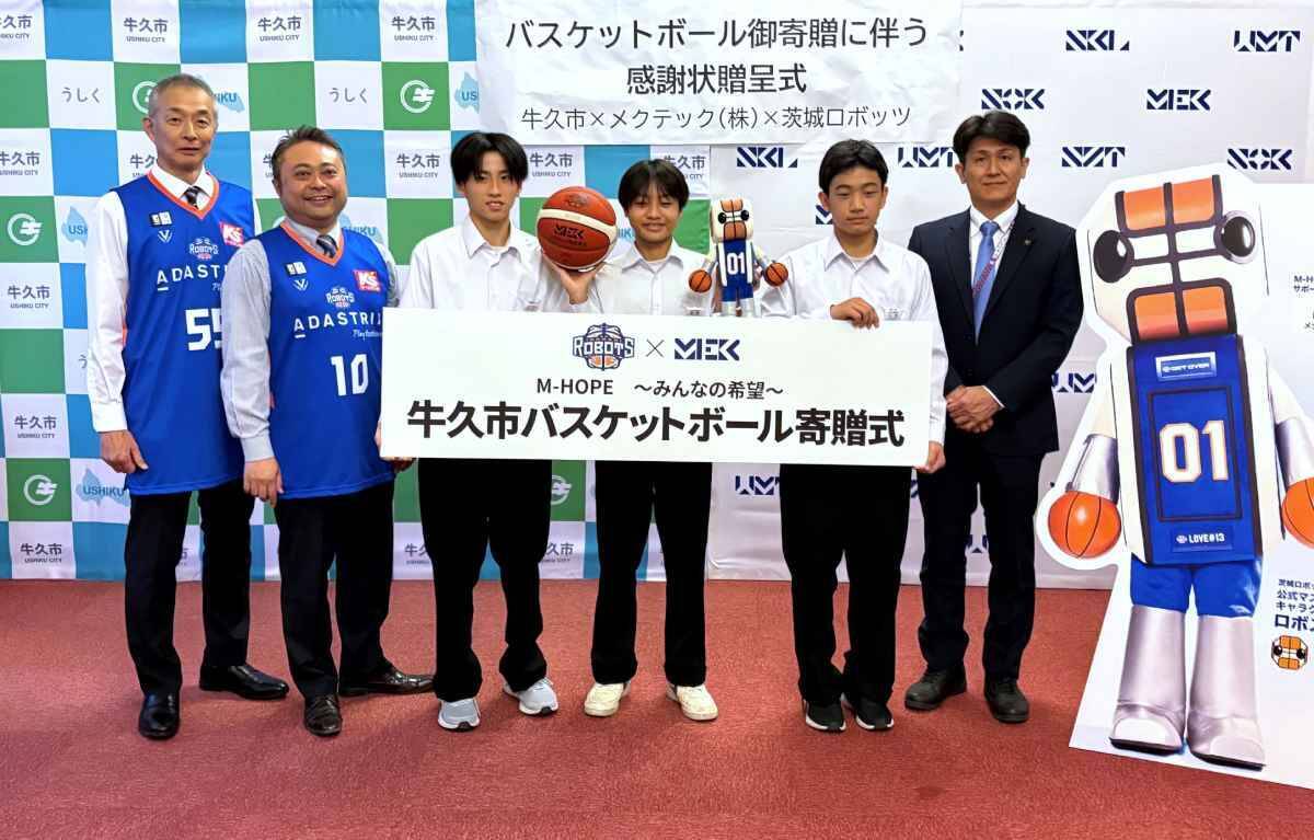 電子部品の製造販売業を営みながら、県内での地域貢献活動にも力を入れており、今回牛久市内の全中学校6校に茨城ロボッツとメクテックのロゴが入ったオリジナルバスケットボール計60球を贈呈することを決定しました。
