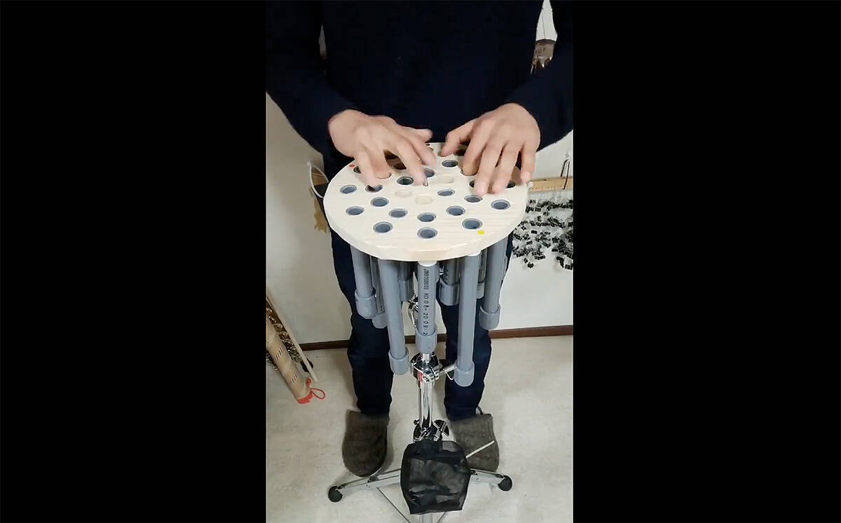 今回話題になった楽器は、「SPOT(スポッと)」と呼ばれるオリジナル楽器です。膝丈くらいの高さのシンバルスタンドに固定された丸いテーブル状の板に、蓮の花のような同心円状の穴を30個空け、長さの異なる塩化ビニール製のパイプを下向きに差し込んだ構造になっています。