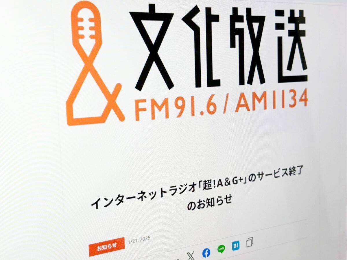 株式会社文化放送は1月21日、自社HPにてインターネットラジオ「超!A&G+」のサービスを、3月31日をもって終了することを発表しました。