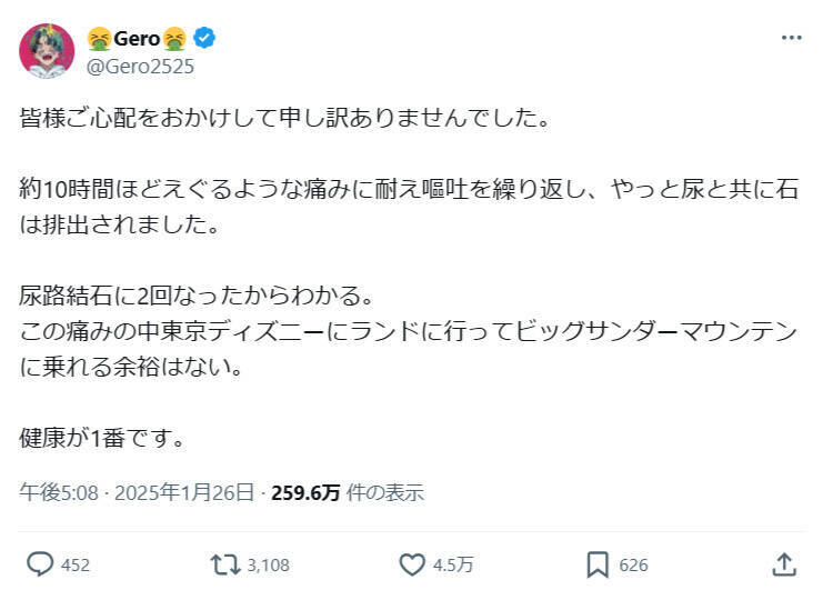人気歌い手のGeroさんが、1月26日に自身のX(旧Twitter)を更新し、尿路結石が再発したことを報告しました。Geroさんは2024年5月にも同じ症状で救急搬送されており、今回が2度目の経験となります。