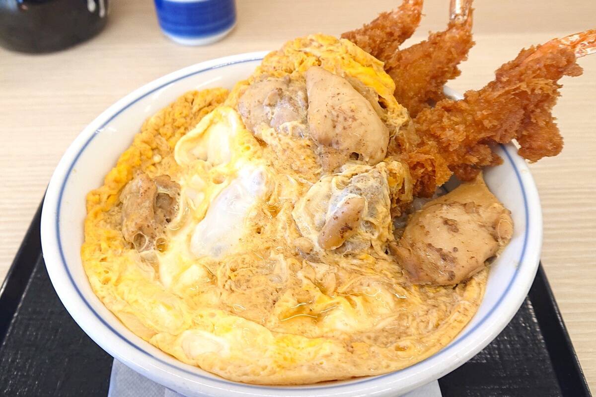 海老フライが3本も豪快に盛られた、「かつや」らしいボリューム満点の新作丼が発売。1月29日より、「海老タレカツと親子丼の合い盛り丼」が期間限定で販売されています。