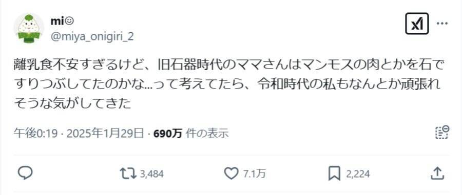 このmiさんの投稿には7万件ものいいねが付き、返信欄には「たしかに原始のママの離乳食作りに比べると、今は楽ですね」「同じく離乳食に不安しかありませんが、この投稿を見てなんとかやれそうな気がしてきました」といった共感の声が相次いで寄せられています。