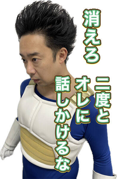 「ドラゴンボール」のベジータのコスプレをした自身の姿に、「消えろ 二度とオレに話しかけるな」「バ…バカの世界チャンピオンだ…」「所詮は素人だな」といった火力の高い一言を添えた画像たちは、Xユーザーの間で大反響。