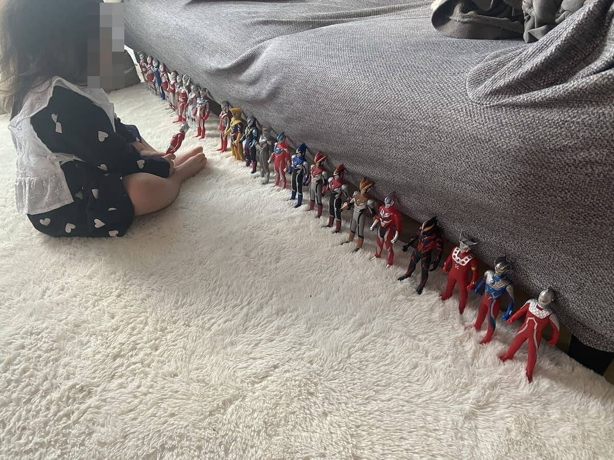 Xユーザーの「みん」さんが投稿したのは、ベッドサイドに整列させられた数十体のウルトラマン人形と、彼らを前に腰を下ろす、るかちゃんの姿。