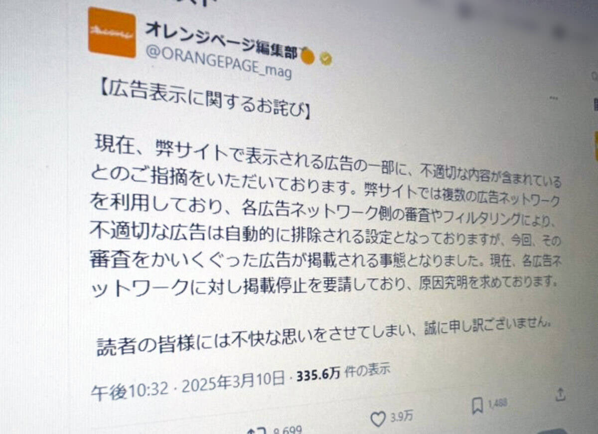 オレンジページをめぐっては、3月10日、Xユーザーの一部から「サイト上に性的内容を含む広告が掲載されている」との指摘の声があがり、注目されていた。オレンジページは料理や暮らしに関する情報を提供するメディアであり、特に女性の支持が厚いことから、今回の問題は読者に強い違和感を与えたとみられる。