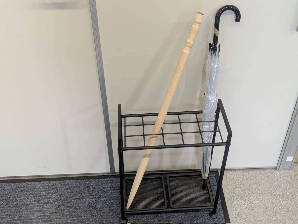 Xに投稿された写真に写るのは、傘立てに刺さっている白い丸い棒。なんでこんなところに棒が?と思いつつ上部をよく見てみると……正体はなんと爪楊枝です。正確には爪楊枝っぽい巨大な棒ですが。