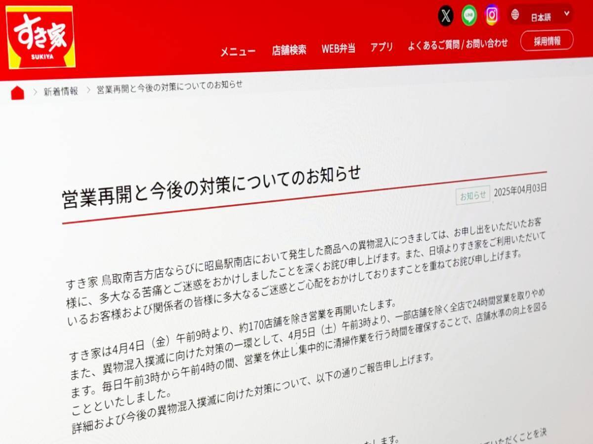 この対応は、鳥取南吉方店と昭島駅南店で相次いで異物混入が発生したことを受けてのものです。すき家は3月31日から4月4日までの間、害虫・害獣の侵入防止と駆除対策を行うために、一部店舗を除いて全店を一時閉店していました。