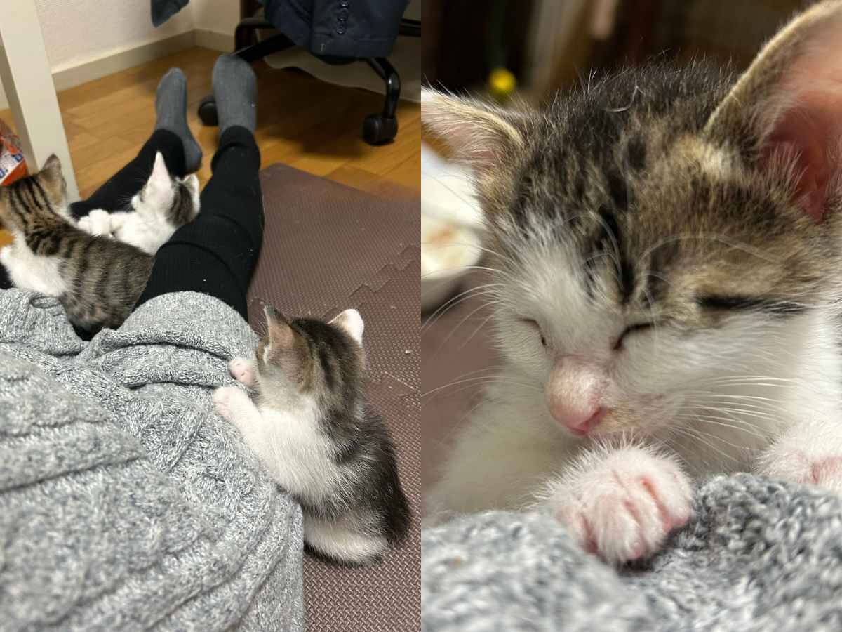 Xユーザー・ふくンツさんが投稿した写真に写っているのは、飼い主さんの足元で子猫3匹が遊んでいる様子。これだけでも十分癒やされる光景ですが、写真には更なる癒やしポイントが存在します。