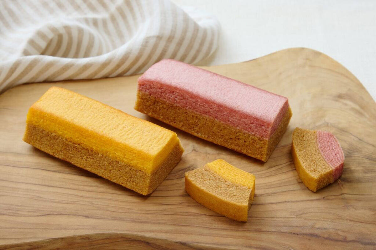 「不揃いバウム ブラン」は、「ブラン」を練りこんだ香ばしい生地に、フルーツ風味の生地を重ねた2層構造が特徴。ストロベリーとオレンジの2種類がラインナップされ、それぞれのフルーツソースやピールを使用することで、爽やかな酸味と穀物の風味が調和した味わいに仕上がっている。