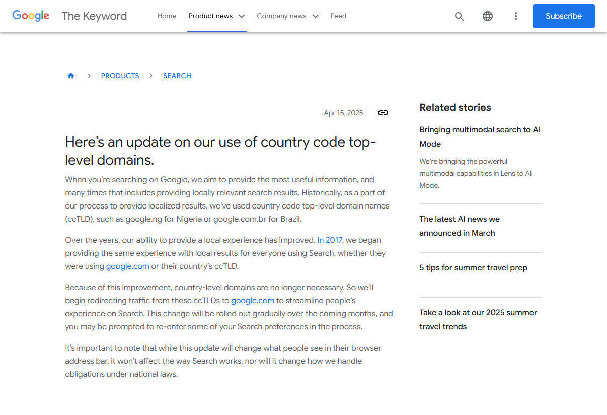 Googleブログ「Here’s an update on our use of country code top-level domains.」(2025年4月15日発表)