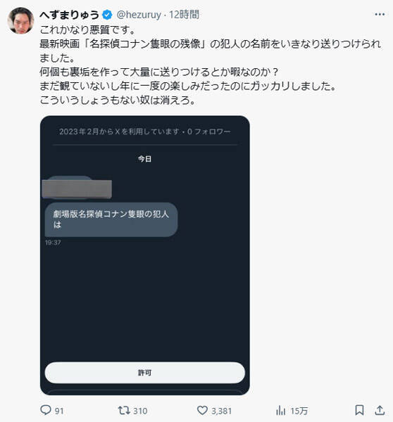 問題の投稿には、Xのダイレクトメッセージ機能を通じて、同映画の犯人の名前が突然送られてきたスクリーンショットが添付されており、へずまりゅう氏は「これかなり悪質です」と強い怒りを示している。