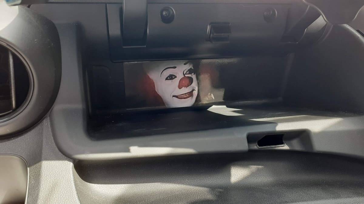 中古で買った車に乗り込み、インストルメントパネルの収納部分を何気なく開けた瞬間、ペニーワイズが顔をのぞかせたら、大パニック間違いなしです。