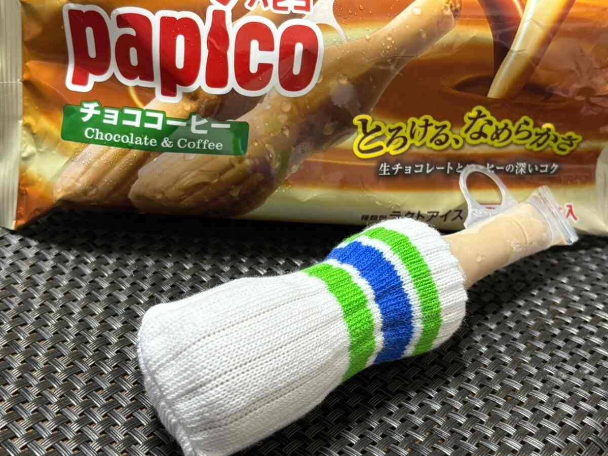 さて、前置きはこの辺にして早速パピコに着せてみましょう。定番の「チョココーヒー味」をもぎって履かせてあげると……あら!かわいいじゃないの!
