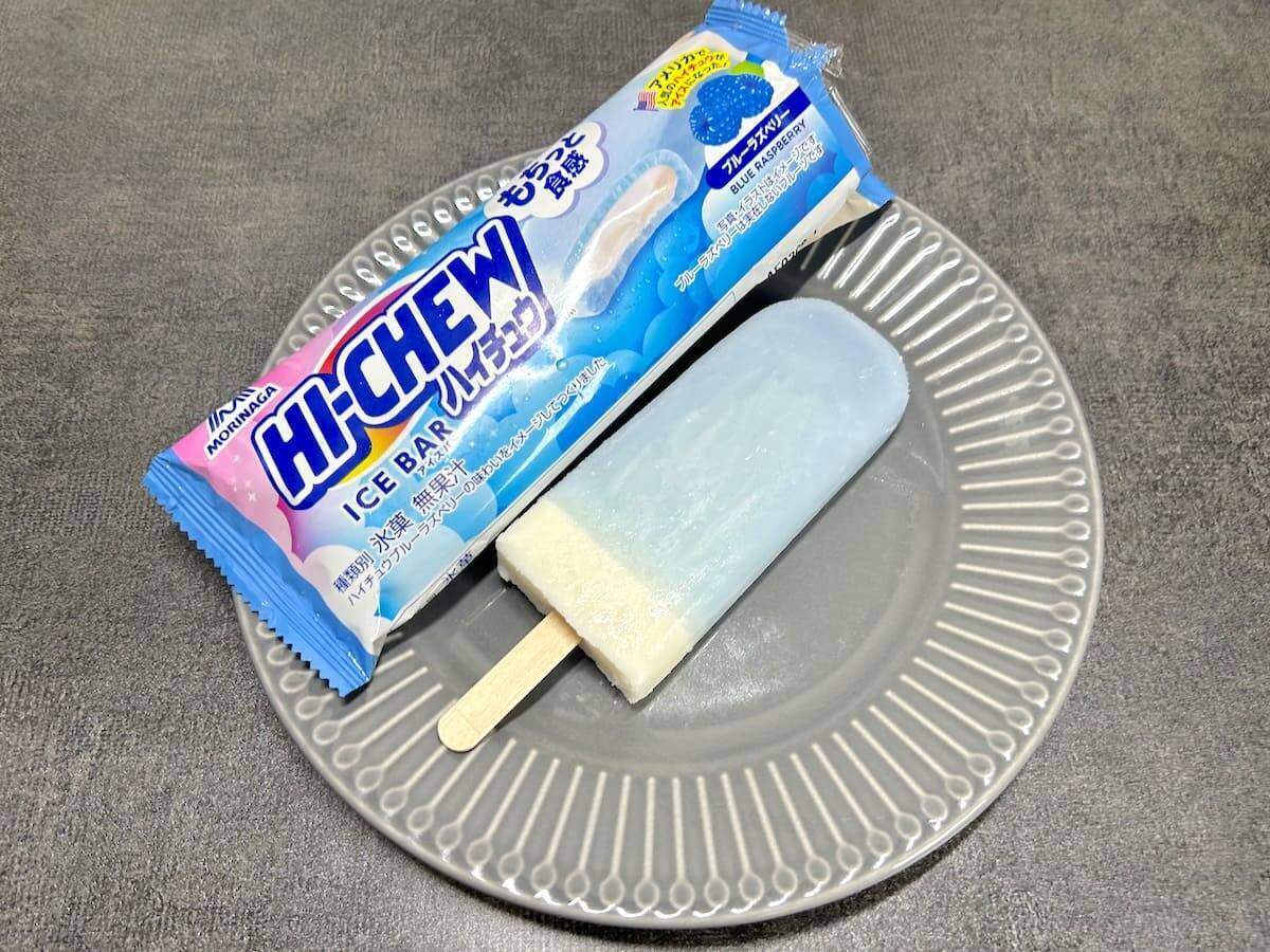 ブルーラズベリーなる聞き慣れない味、かつハイチュウの「もちっと食感」が楽しめるアイスとのことで、「情報が多すぎる!」と思いながら早速買って食べてみました。