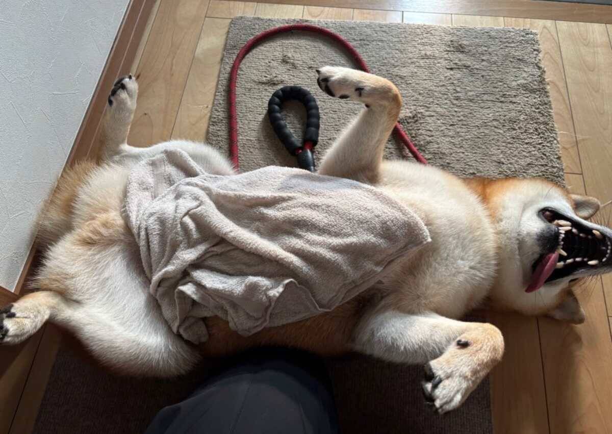 「どう見ても、散歩終わりに足を拭いてもらう態度ではない」――飼い主さんにそうつぶやかれてしまったのは、3歳になる柴犬の岳(がく)くん。