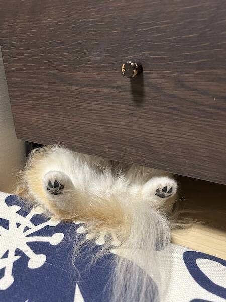 画像の中でいぶきちゃんは、棚付きチェストと床の隙間にヘソ天状態ですっぽり収まっています。後ろ足の肉球とふわふわのお尻だけをこちらに見せた、かなりユニークな寝姿です。