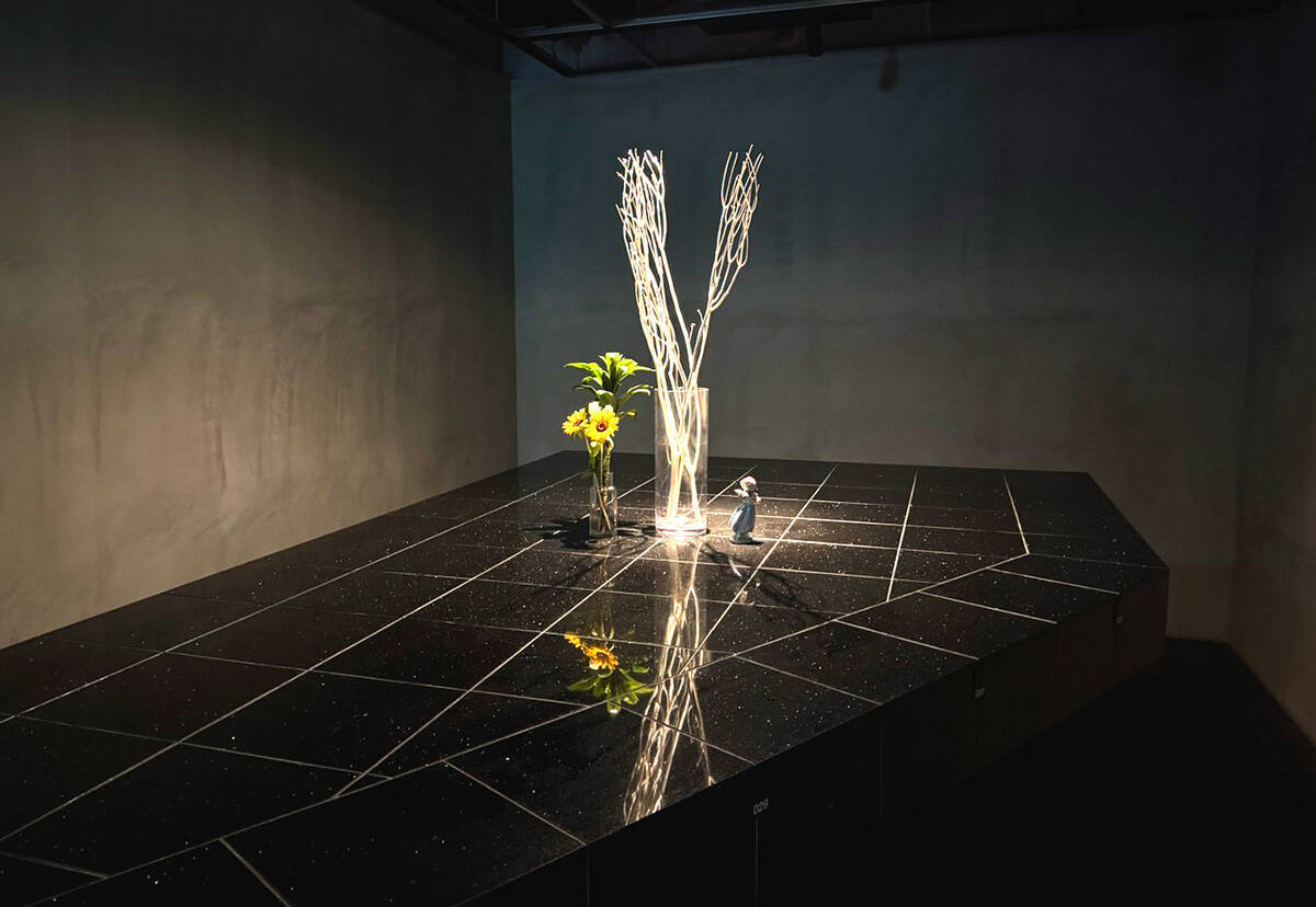 照度を落とした店内は黒とグレーで統一され、黒くつややかに光る石のテーブルにはモダンなオブジェがぽつんと置かれています。外の喧騒とは対照的な、はりつめた静けさ。ここは私たちの知る「立ち食いそば店」なのでしょうか?