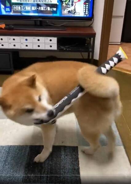 飼い主さんによると、今回の動画はおもちゃの刀を尻尾に挟んで遊んでいたときに撮影したもの。普段からこの刀でよく遊んでおり、くるんと丸まった尻尾には、ほかのおもちゃも挟めるのだそうです。