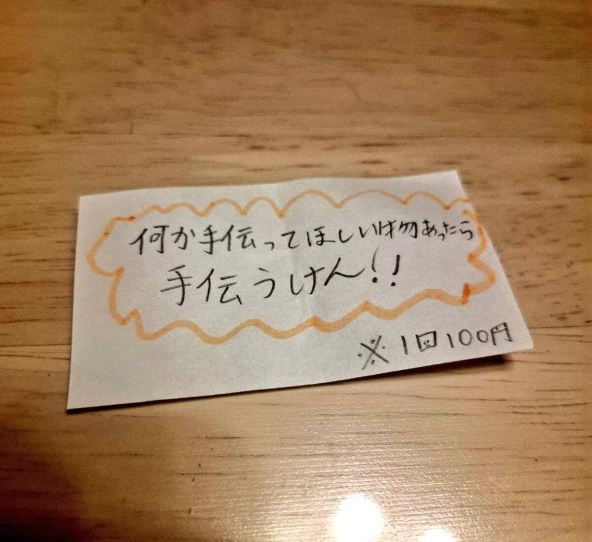 そこには「何か手伝ってほしい物あったら手伝うけん!!」と心温まるメッセージが記されていますが、右下には小さく「※1回100円」の文字が。この抜け目のなさ、将来大物になりそう。