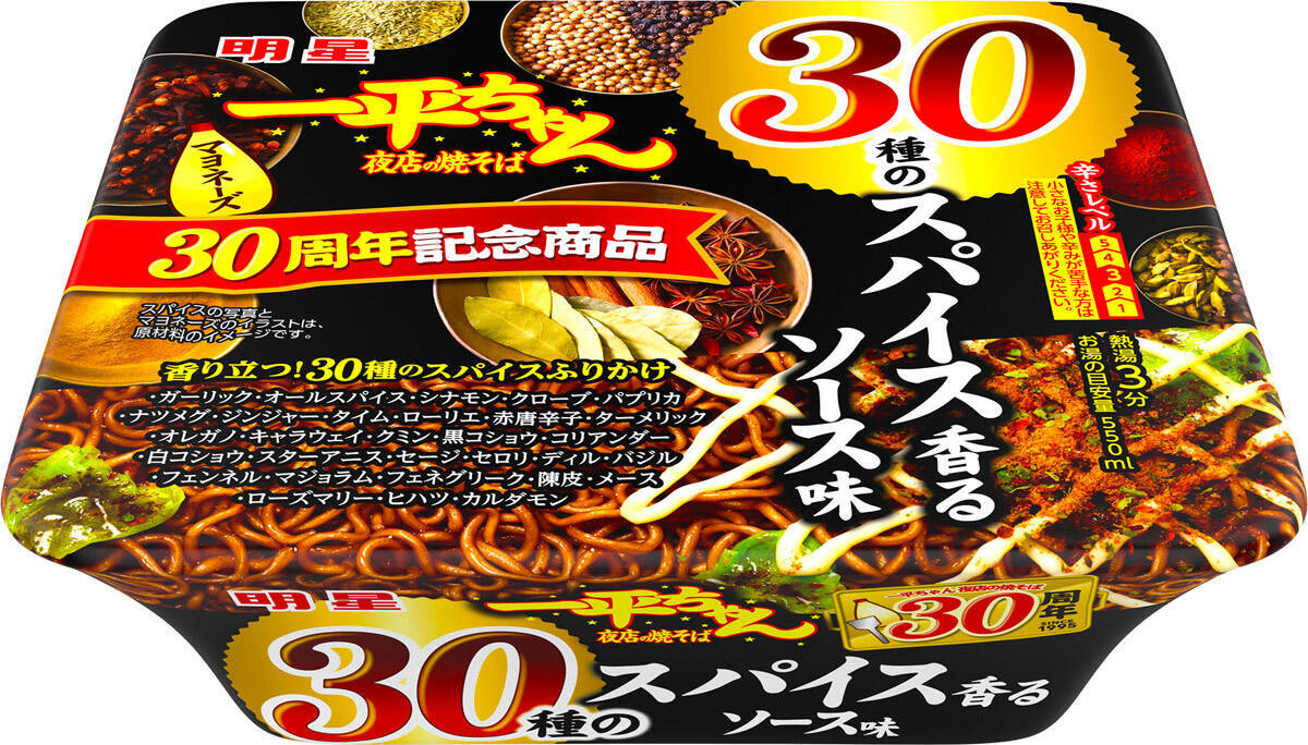 記念商品の第1弾「ショートケーキ味」に続く第2弾となる今回は、“30”にちなみ、厳選した30種類のスパイスを配合したソース焼そばです。