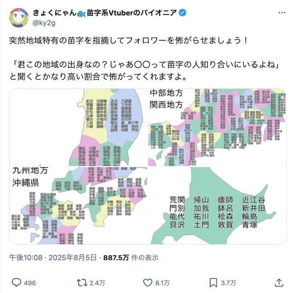 苗字に関する同人誌の発行などをしているXユーザーの「きょくにゃん 苗字系Vtuberのパイオニア」さんがこのほど投稿したのは、「地域特有の苗字」をまとめた日本地図。