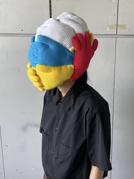 美術大学に通うXユーザーの「ねこぱんち」さんがこのほど投稿したのは、頭から顔までをすっぽりと覆うマスクの写真。カラフルな軍手の中に針金と綿を詰め、糸で縫い合わせてつなげたものだそう。