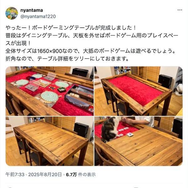 Xユーザーの「nyantama」さんがこのほど投稿したのは、自身でイチから制作したボードゲーミング用テーブルの画像。